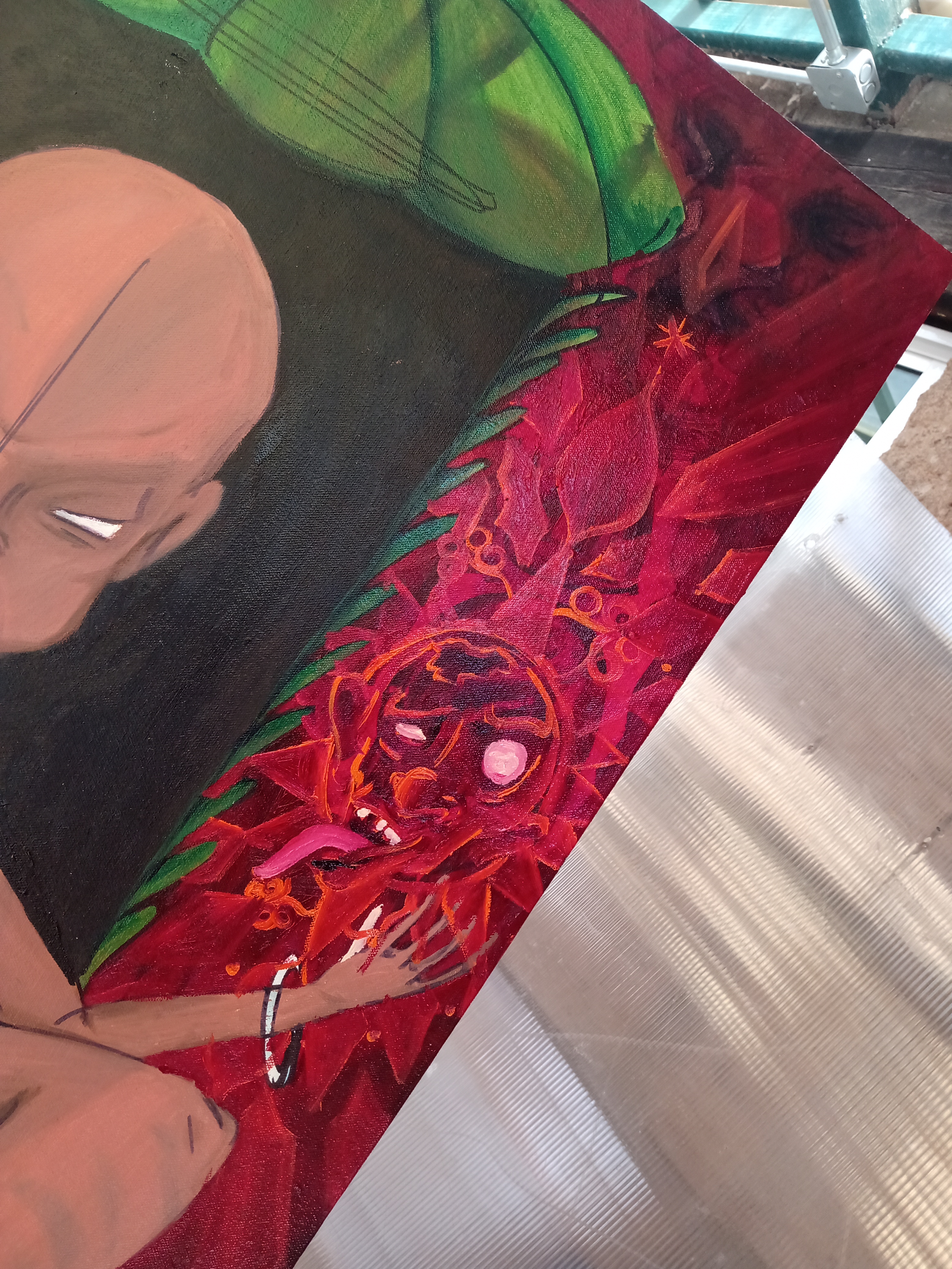 Muchas vueltas, ejercicios. Cambios y caminos de la vida la fui modificando poco a poco. Primero el suelo, luego el fondo. Y un día me di cuenta que la estaba pintando con el único propósito de hacer enojar a la banda. Lo cual, pues no es el plan.